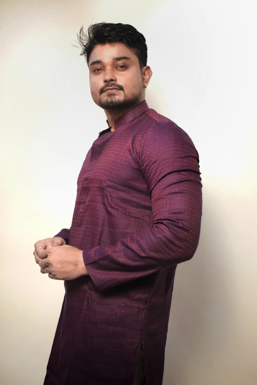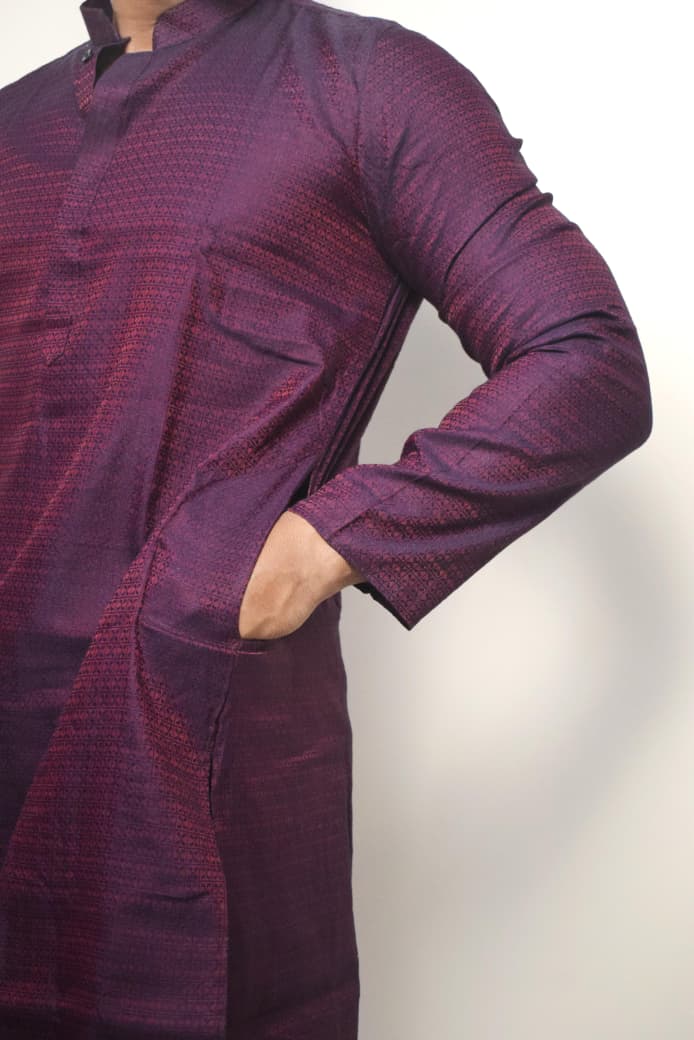 Step into the spotlight with this sophisticated Wine Purple Kurta. Designed for the modern man who appreciates traditional roots, this kurta features a subtle self-textured pattern that adds depth and a premium feel to the rich silk-blend fabric.