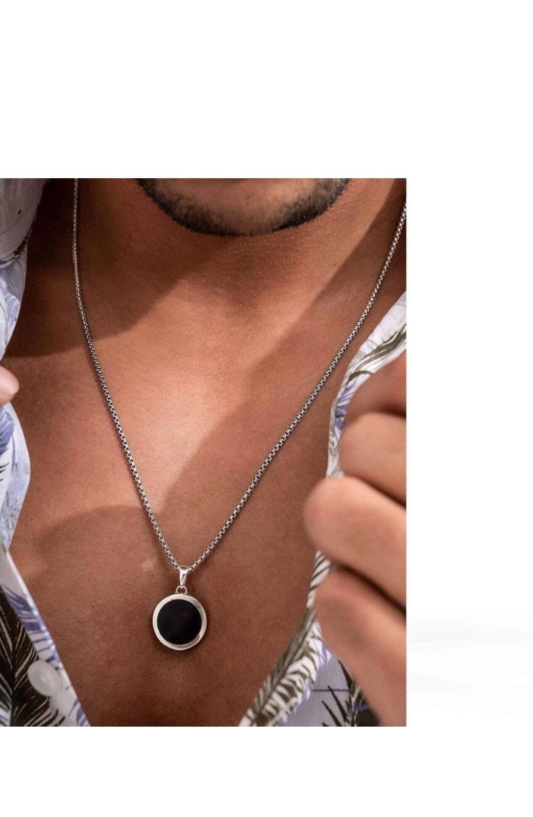 Timeless design meets modern craftsmanship. This circular pendant features a smooth, deep-black inlay set within a polished silver-toned frame. Its clean lines and balanced proportions make it an essential everyday accessory for the modern man who appreciates understated elegance.